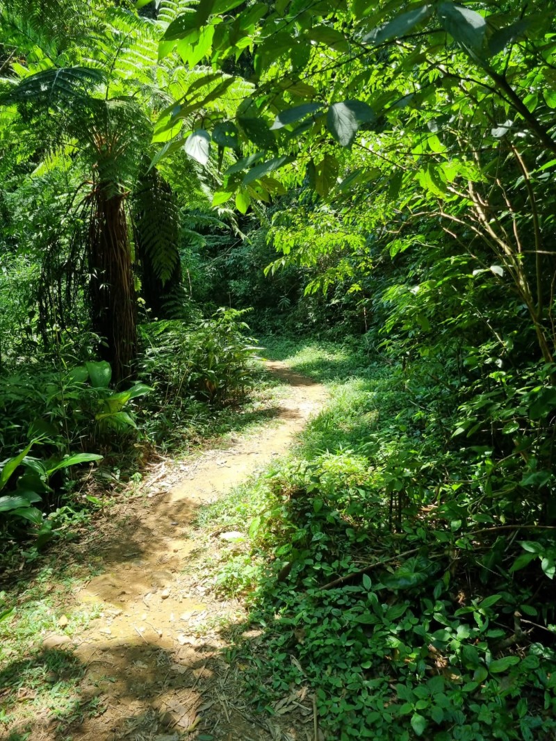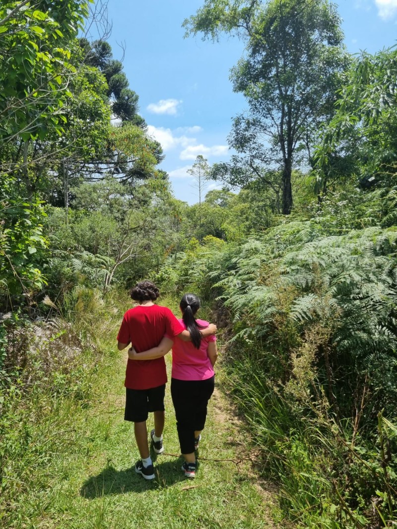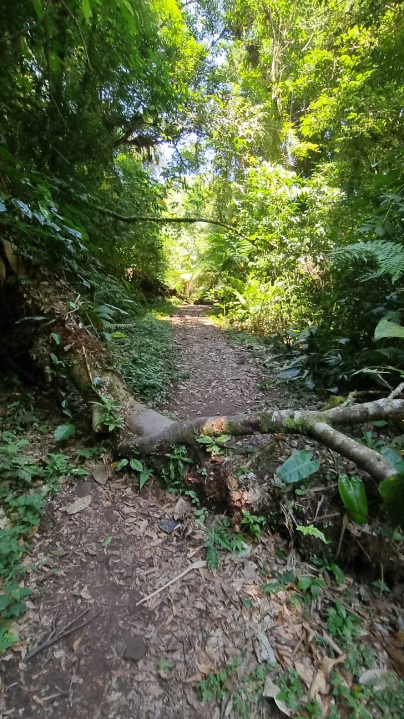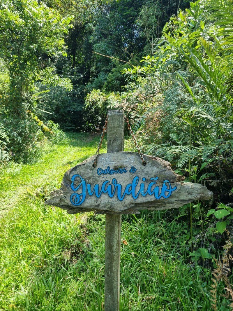 A partir desse ponto, iniciamos uma caminhada de mil metros até a Cachoeira do Guardião, que durou cerca de 20 minutos. A pequena trilha se apresentou encantadora, com muita sombra, pássaros e árvores nativas.