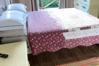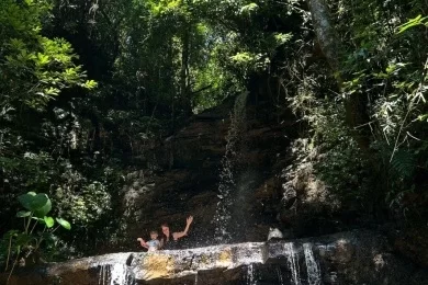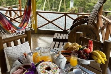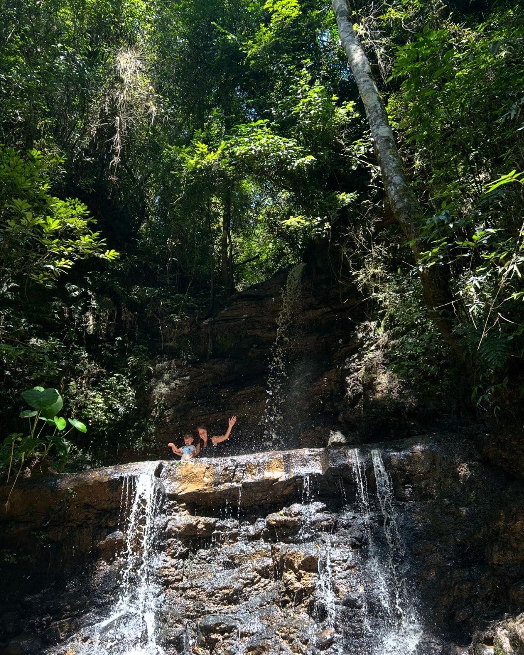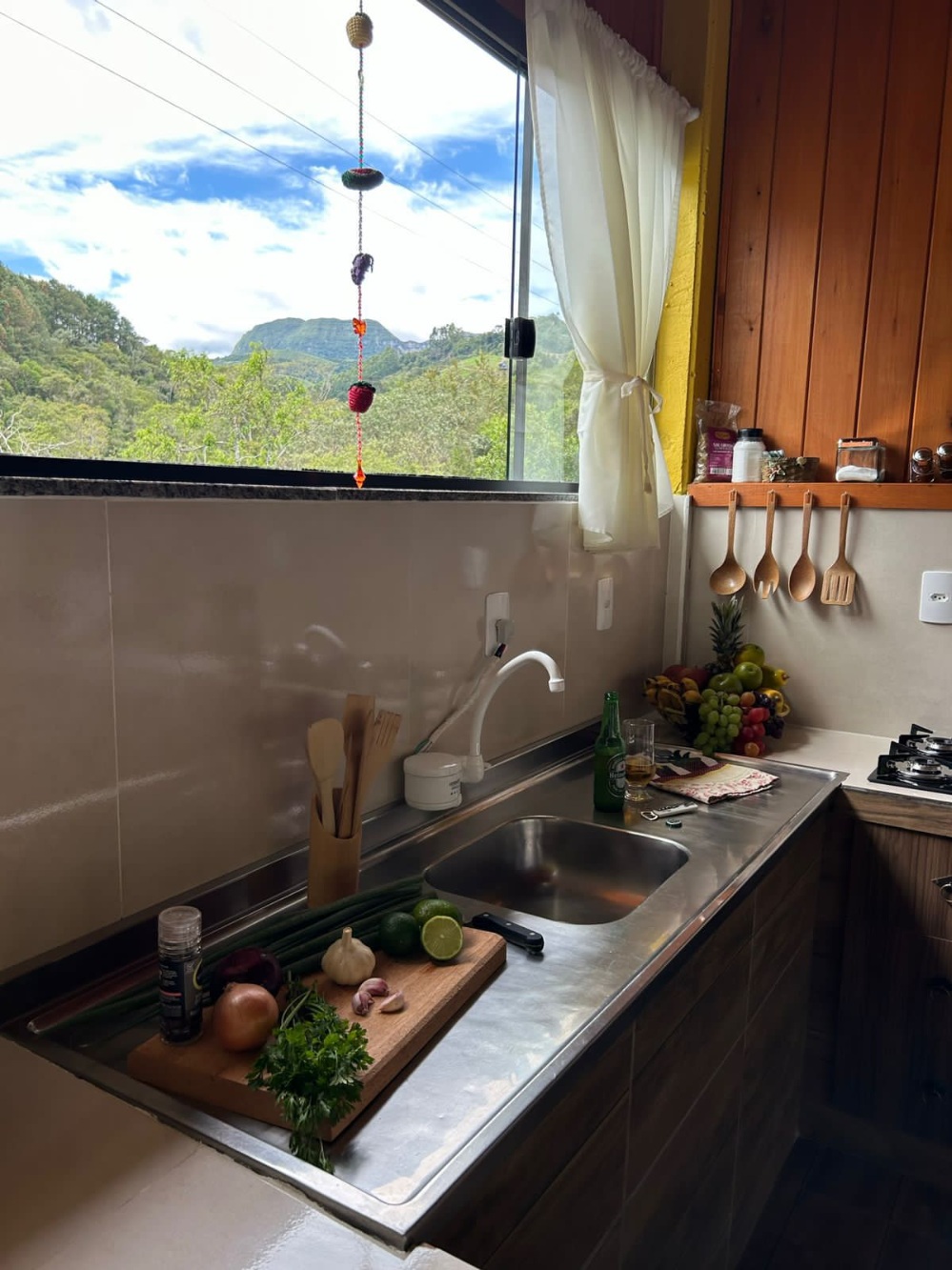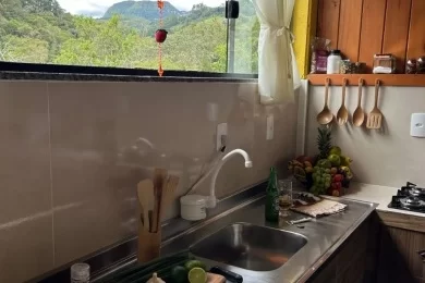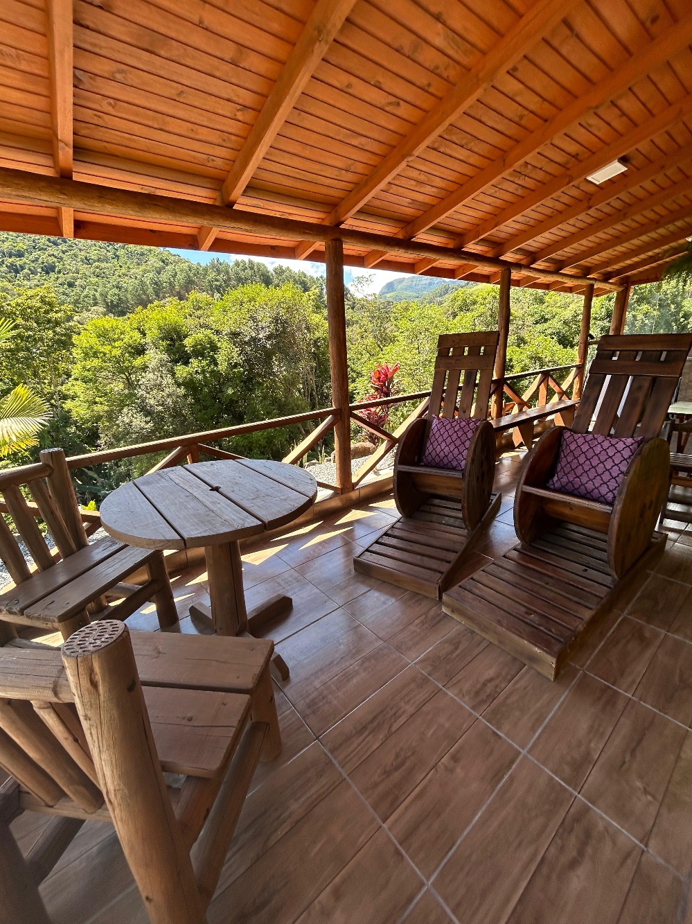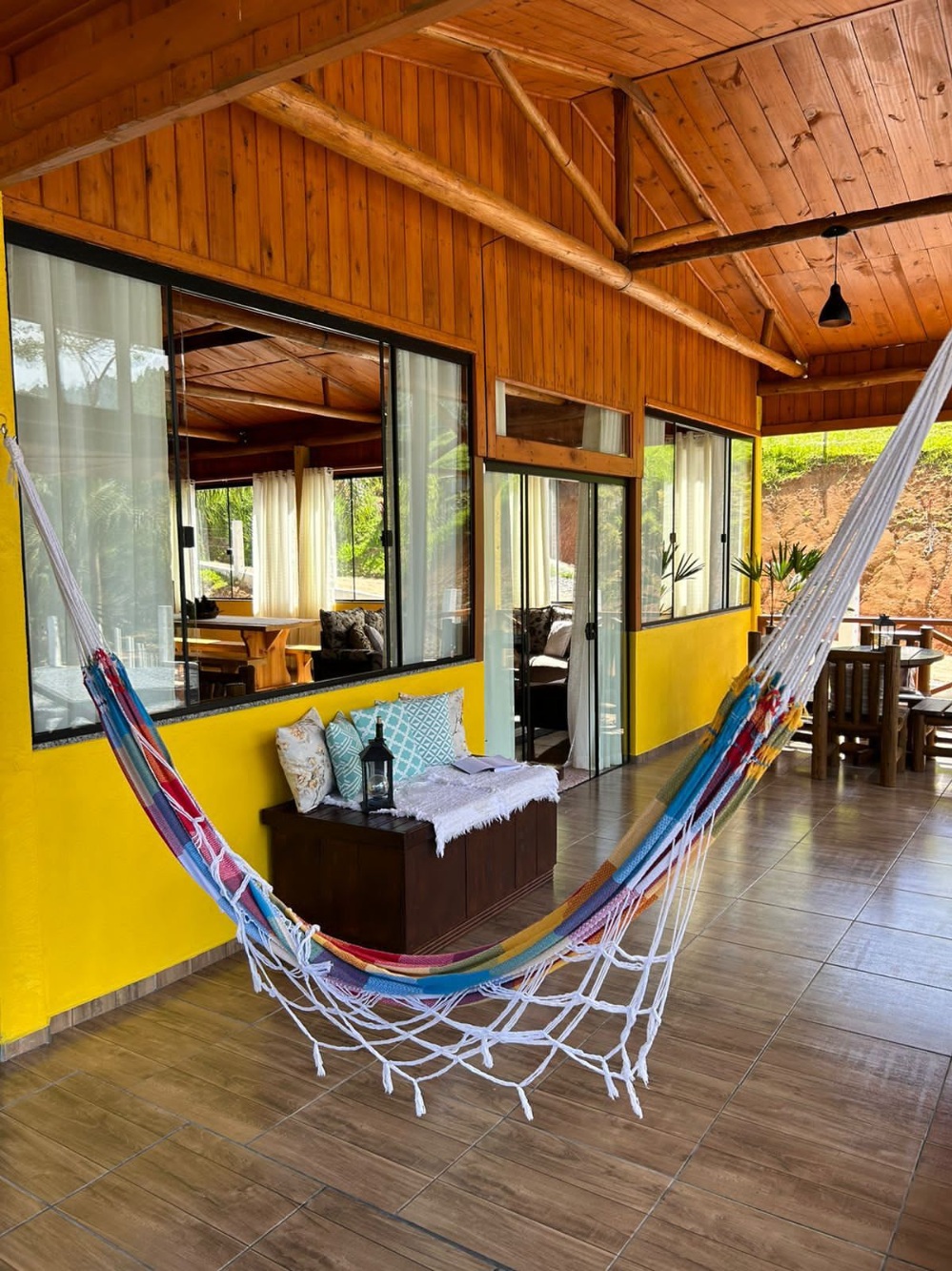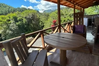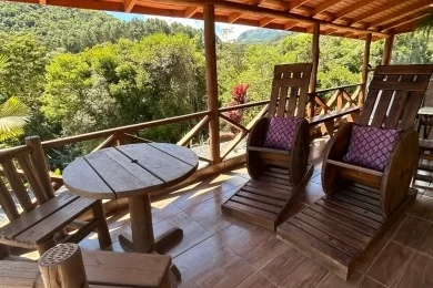 O local conta com rio e cachoeiras de águas cristalinas, acessíveis por trilha fácil. A hospedagem oferece um quarto privativo com cama de casal com deck, varanda com churrasqueira, cozinha e sala integrada e um banheiro.