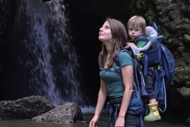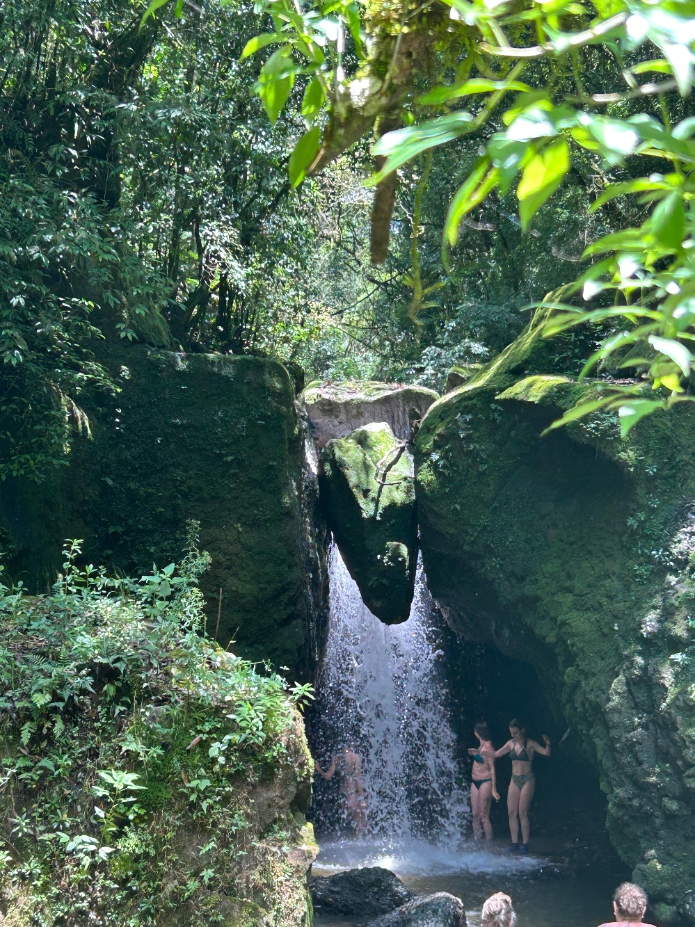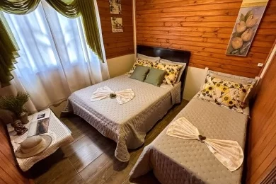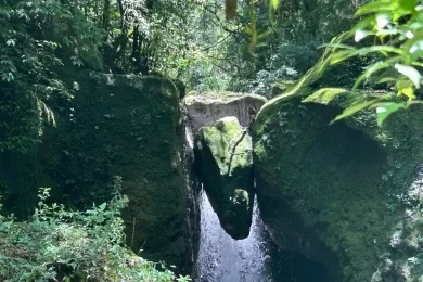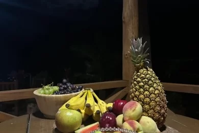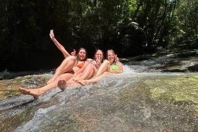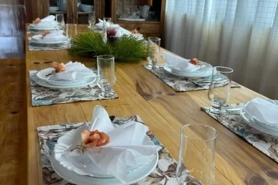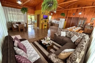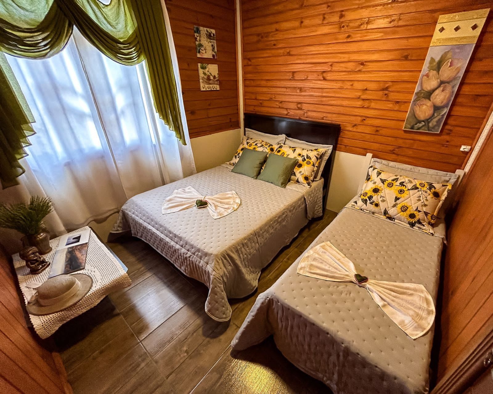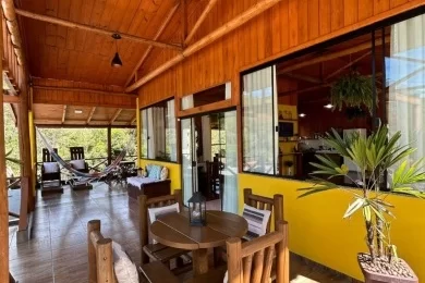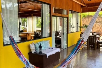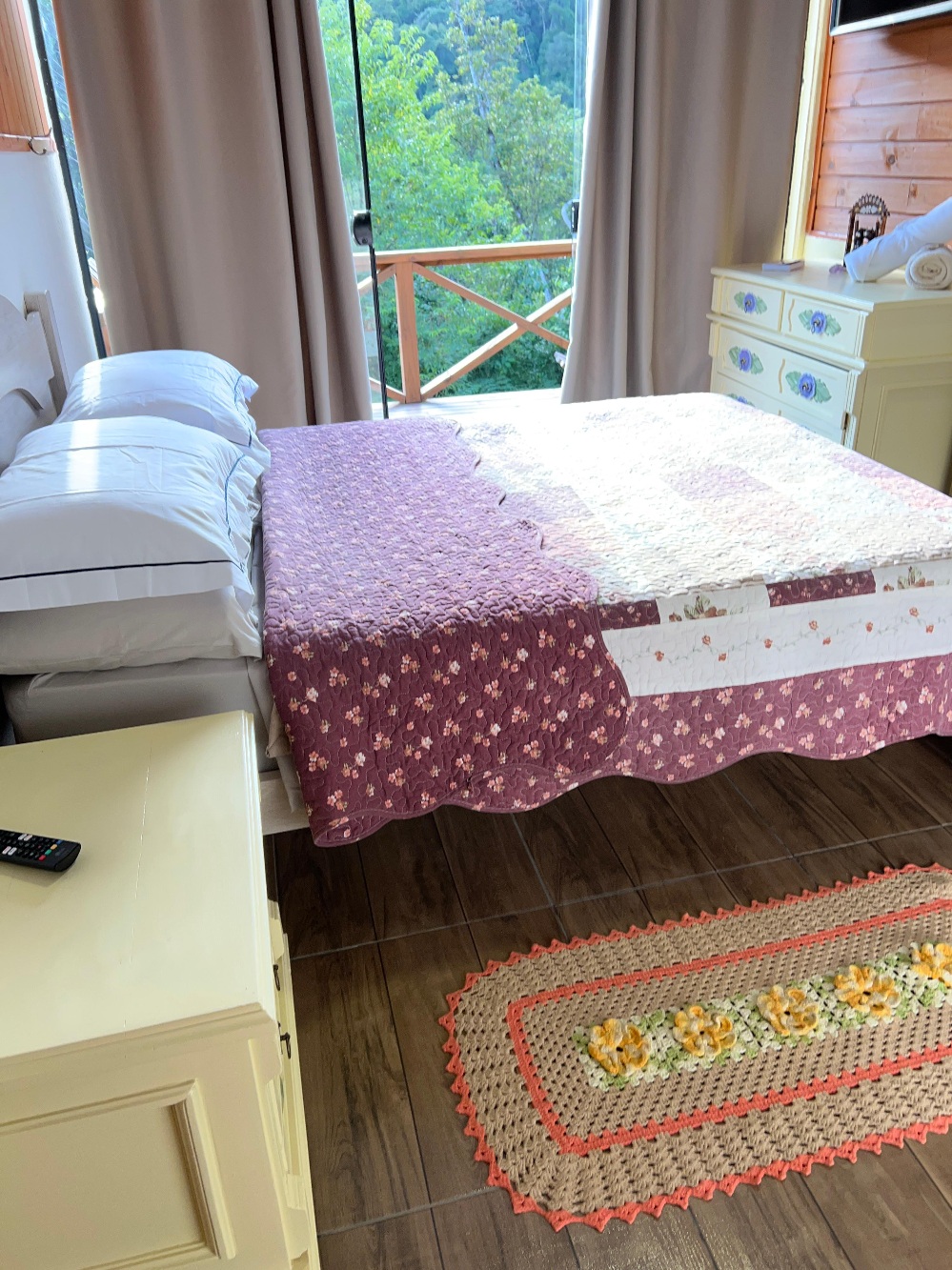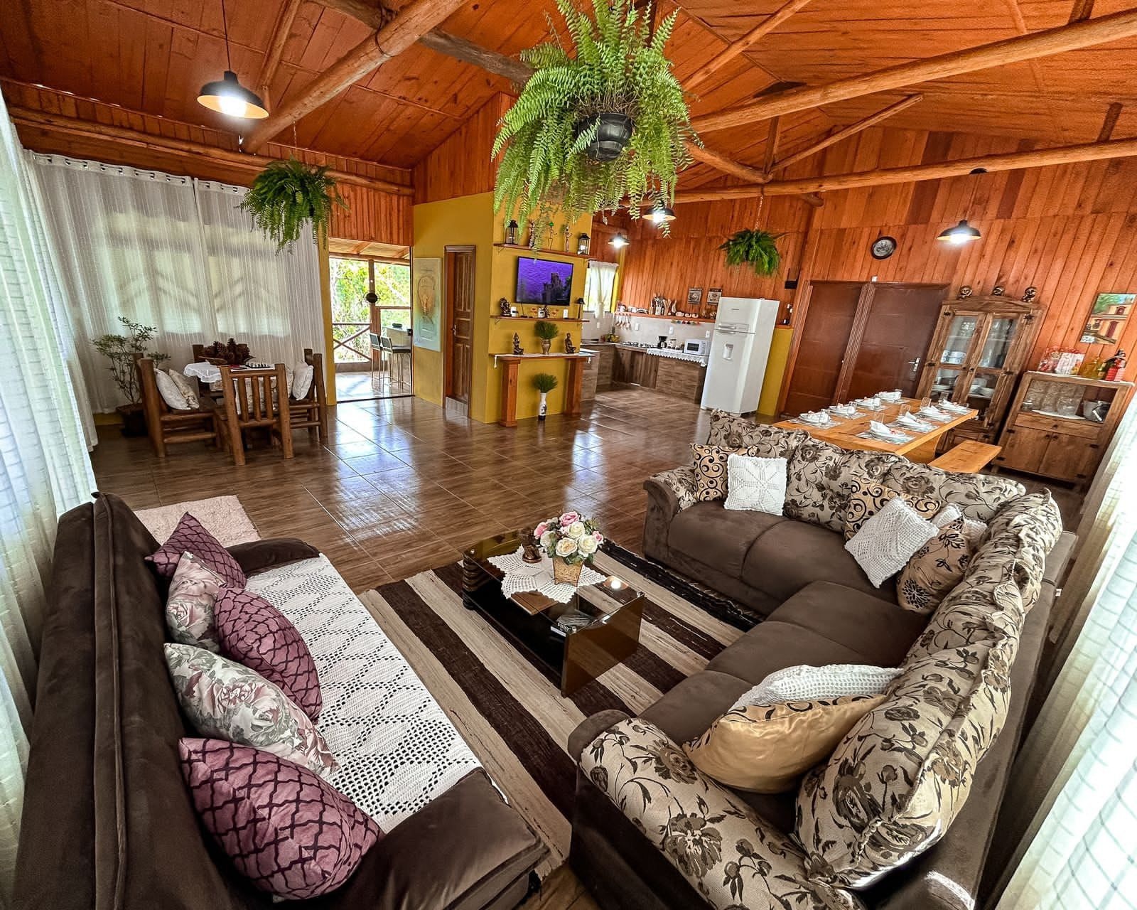 O local conta com rio e cachoeiras de águas cristalinas, acessíveis por trilha fácil. A hospedagem oferece um quarto privativo com cama de casal com deck, varanda com churrasqueira, cozinha e sala integrada e um banheiro.